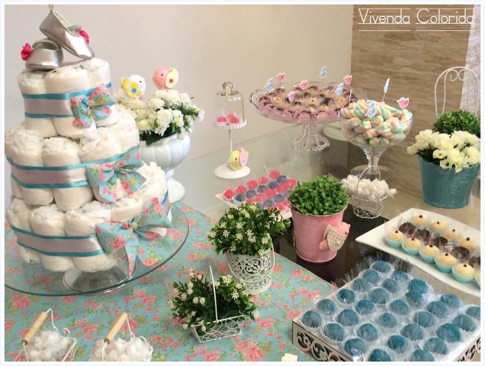 - Tema Corujas, com esse tema você pode usar cores variadas. E é um tema que serve também para meninos, é só investir no azul. Para mais ideias de decoração de chá de fraldas com o tema de corujas confira Chá de bebê Corujas, para meninas e meninos.