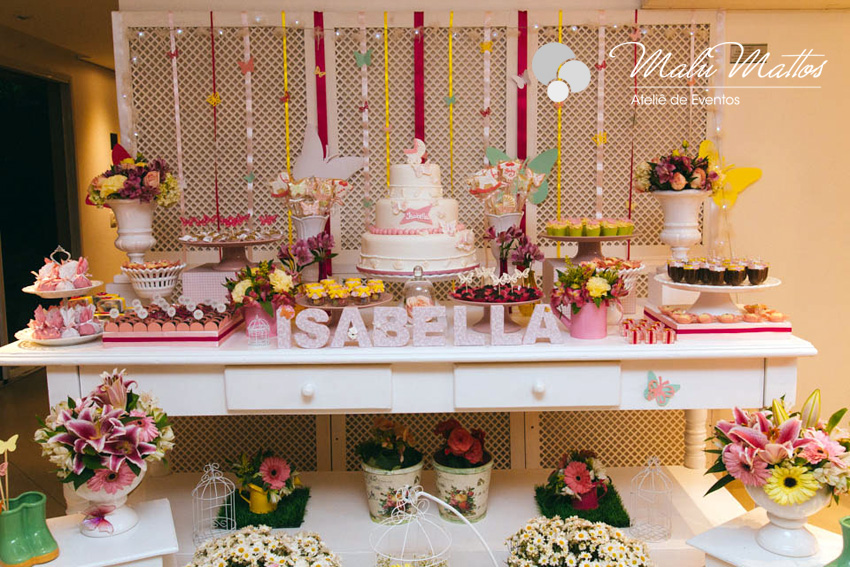 - Flores, escolha super feminina e delicada. Aquelas flores penduradas na parede atrás da mesa ficaram lindas. Adorei! Confira também outra tema bem delicado, Chá de bebê com tema bailarina.